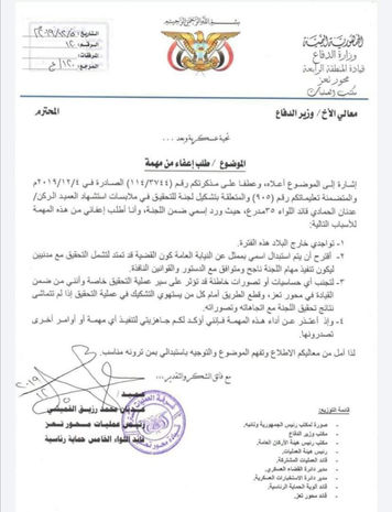 العميد /عدنان رزيق يعتذر لوزير الدفاع في مهمته التي كلف بها في التحقيق في مقتل الشهيد القائد عدنان الحمادي